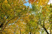 Omhoogkijkend in een bos met verschillende herfstkleuren en een blauwe lucht erboven in een bos in de Duitse regio Hessen tijdens een mooie herfstdag.