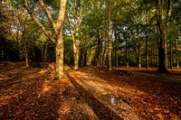 Herfstkleuren en gevallen bladeren op een oud bospad .