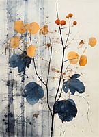 Abstract werk van herfst kleuren, takken met blauw, oranje en rood met op de achtergrond een berkenbos.