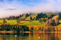 Een mooie vroege herfstochtend aan de Grüntensee, een meer in de Allgäu, nabij Kempten, in Beieren, in het zuiden van Duitsland.