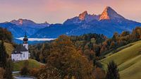 Een 16:9 foto van een zonsopkomst in de herfst met volop herfstkleuren bij de Bedevaartskerk Maria Gern, met uitzicht op de berg Watzmann en de Berchtesgadener Alpen.