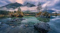 Een 16:9 foto van een ochtend tijdens zonsopkomst tijdens de herfst met ochtendnevel bij de Hintersee, een meer op het grondgebied van de gemeente Ramsau bei Berchtesgaden in het Berchtesgadener Land in het zuiden van de Duitse deelstaat Beieren.