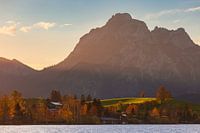Het is Herfst en zonsopkomst met herfstkleuren bij de Hopfensee, gelegen bij de plaats bij Hopfen am See, met de Allgäur Alpen in de achtergrond.