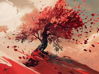 Het schilderij toont een enkele boom, majestueus en sterk, die oprijst tegen een winderige, crèmekleurige lucht. De bladeren van de boom, in hartstochtelijke roodtinten, worden gegrepen door de wind en de lucht in geslingerd, waardoor een gevoel van vrijheid en onstuimige kracht ontstaat. De dynamiek van de wind wordt benadrukt door de vegende beweging op de achtergrond en de vallende bladeren, die als rode regen op de aarde vallen. Deze afbeelding is een prachtig, zij het vluchtig moment dat de vergankelijkheid en gelijktijdige eeuwigheid van de natuur vastlegt.