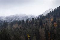 Herfst gaat over in winter in de hoge Vogezen als sneeuw begint te vallen op de hogere delen van de berg. Seizoensveranderingen in de bossen van Grand-Est, Frankrijk. Wabi-sabi invloed.
