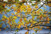 De takken van een imposante eikenboom die hangend langs de bosrand tegen een mistige blauwe achtergrond afsteken. De kleur van de bladeren is laat in het herfstseizoen veranderd in een prachtige schakering van geel, groen, oranje en streek fel af tegen de donkere takken van dit sfeervolle herfstbeeld. De kleurrijke herfstbladeren aan deze herfstboom geven een idyllisch mooi sfeerbeeld van het najaar.