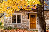 Een charmante stenen gevel, omlijst door felgele herfstbladeren, nodigt je uit om te dromen. De warme houten voordeur is uitnodigend en belooft een gevoel van geborgenheid. Dit beeld is perfect voor de woonkamer, waar het een gezellige sfeer creëert en herinneringen oproept aan ontspannen herfstdagen.