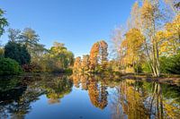 Deze foto is gemaakt op een prachtige herfstdag in november 2022 in het Dr. J. P. Thijssepark in Amstelveen. De bomen, getooid in herfstkleuren, weerspiegelen in het rimpelloze water van de vijver. De lucht is strakblauw.
