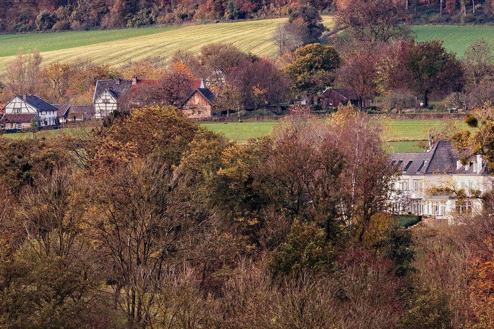 Historische boerderijen tegen de achtergrond van het Onderste bos in het Limburgs Heuvelland bij Epen.