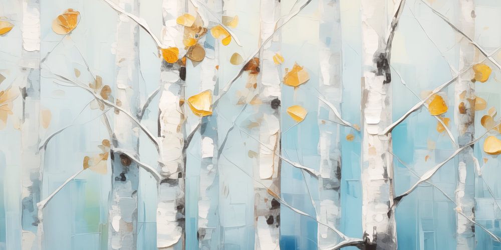 Dit kunstwerk, getiteld "Herfst in Harmonie", is een visuele viering van de overgang tussen de seizoenen. Het stelt een bos van berkenbomen voor, waarvan de witte schors sterk contrasteert met de zachte pasteltinten van de achtergrond. De bomen staan stevig geworteld in de aarde, terwijl hun takken naar de hemel reiken, alsof ze de laatste zonnestralen van het seizoen proberen te vangen.