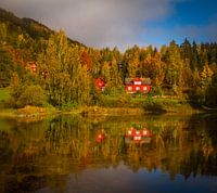Herfst in Lillehammer in Oppland Noorwegen. De reflectie in de lake en de herfstkleuren. De korte herfst wordt snel gevolgd door een lange koude winter.