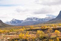 De berkenbomen kleuren geel in de herfst in Rondane in Noorwegen, op de bergen ligt verse sneeuw