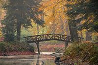 Achter in het Slochterbos bij de Fraeylemaborg in Slochteren in de provinvie Groningen staat dit mooie sfeervolle houten bruggetje tussen dennebomen en loofbomen.