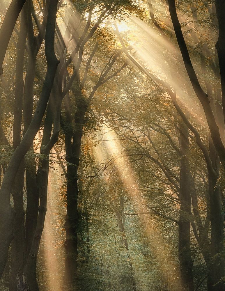 Herfst in het Speulderbos. De zon zorgt voor prachtige goudgele zonnestralen welke door de bomen het bos indringen.