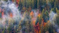 Lage bewolking en mist hangen tussen de bergen en bossen met de herfstkleuren van Oktober tussen Cortina d'Ampezzo en San Vito di Cadore, in de Italiaanse provincie Belluno, Dolomieten, Italië.