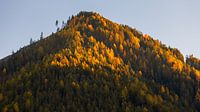 Het laatste zonlicht van de dag waarbij de Lariks / Lork (een geslacht van coniferen) bomen hun goud gele gloed tijdens de herfst laten schijnen in Zuid-Tirol, in het Italiaanse Dolomieten gebergte.