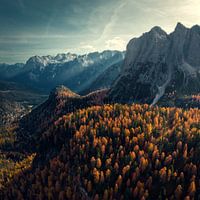 herfstkleuren in de Dolomieten. De foto is genomen met een drone. Op de foto "Lago Antorno"