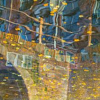 Geelgouden bladeren waaien en dwarrelen over kade en gracht, herfst het seizoen van het gouden licht, onverwachte windvlagen en regenbuien. Maar ook kraakheldere opklaringen waardoor het blauw veel koeler lijkt en het geel veel warmer. Door de wind komt het water in de gracht in beweging en veroorzaakt een deining in de spiegeling.