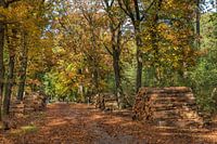 Herfst in de bossen bij Kootwijk met houtstapels.