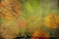 Herfstbladeren en herfstkleuren. Oker en groen. Spinnenwebben en bladnerven samengevoegd tot een abstract geheel.