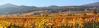 Panoramisch uitzicht over de herfstkleurige wijngaarden bij het dorp Sooß in de Thermenregio aan de rand van de Alpen, Oostenrijk