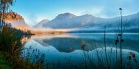 Mist over de Almsee in het Almtal (Oostenrijk)