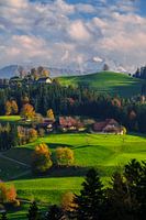 Het Berner Oberland in Zwitserland met zijn vele individuele lindebomen op idyllische heuvels biedt een perfecte achtergrond voor elk seizoen. Het schilderachtige landschap is vooral mooi in de gouden herfst. Op de achtergrond torenen de machtige vierduizendertoppen van de Zwitserse Alpen boven het heuvellandschap uit.