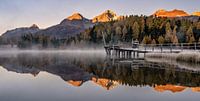 Ochtendmist en gouden lariksen op het Stazer meer in het Engadin bij St. Moritz. De alpengloed van de Zwitserse bergen en de badsteiger worden weerspiegeld in het spiegelgladde meer op een ijskoude herfstochtend bij zonsopgang.
