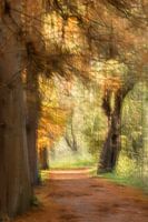 herfst kleuren en het ochtend zonlicht in het park geven een prachtig effect voor de fotografie. Het prachtige wandelpad in het Provinciaal park Rivierenhof te Antwerpen. Deze bepaalde dennenbomen geven een extra mooi effect in de landschap fotografie.