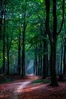 In de verte vallen lichtstralen door de bomen. De herfst dat zijn intrede in het Speulderbos