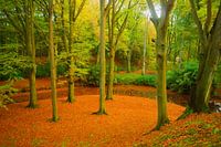 Landgoed Elswout in de herfst. Grote oude beuken op oranje herfstbladeren in het prachtige bos bij Haarlem.