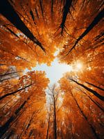Groothoekbeeld, naar boven is gericht waardoor er een kunstzinnig beeld ontstaat van boomtoppen in mooie herfstkleuren.