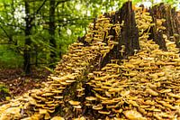 een muur van paddestoelen klimmen tegen deze boomstronk op een zee van paddestoelen lijkt op een kleine kabouterstad.