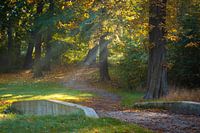 Zonnestralen schijnen door zachte mist op een pad in het Dieskauer Park op een ochtend in de herfst.