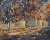 Het Villapark in Maastricht met haar verdedigingsmuren getooid in herfstkleuren. Een prachtig impressionistisch werk van Nop Briex die Maastricht zo lief heeft.