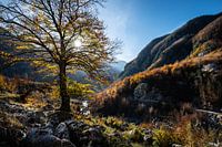 Herfst kleurt het Albanese landschap geel en oranje. Zon schijnt fel door de takken van een herfst boom. Hike door de Albanian alps.