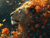 Deze krachtige afbeelding laat een leeuw zien omgeven door een vurige explosie van herfstbloemen. De diepe, warme tinten van oranje, goud en geel in de bloemen complementeren de natuurlijke kleuren van de leeuw en geven het beeld een gevoel van nobelheid en gratie. De donkere achtergrond versterkt de intensiteit van de bloemen en het majestueuze dier. Dit kunstwerk zou een sfeer van elegantie en kracht toevoegen aan elk interieur, perfect voor een luxueuze woonkamer, een stijlvol kantoor, of een ruimte die een connectie met de wilde natuur uitstraalt.