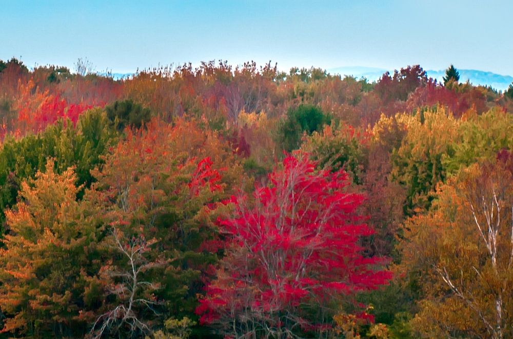 Levendige herfstscène langs een rivier in de staat Maine. Veel kleuren, warm en koel, met reflecties en een prachtige lucht en berg op de achtergrond.