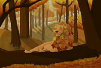 Een herfst leeuw liggend in de laagstaande zon. Zijn vacht veranderd in herfst bladeren, ligt hij te zonnen op een omgevallen boomstam. Trots en relaxed.