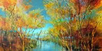 Glinsterend verblindend licht in een herfstbos in tinten van blauw, turkoois, rood en oranje. Verder blauwe lucht, weerspiegeling van de herfstkleuren in het water. Kleurrijke herfstbladeren. Een foto met een positieve uitstraling die je in een vakantiestemming brengt.