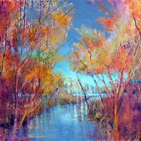 Heldere hemel met brede horizon, sterk contrast met de rode en gele herfstbladeren. De foto straalt kracht en levensvreugde uit. De intense kleuren worden weerspiegeld in het water van de kleine rivier.