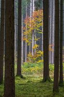 Herfst met mist in het bos. Loofboom op een open plek rond een naaldbos