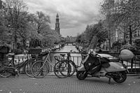 De bomen hebben een herfstkleur gekregen op de Prinsengracht in Amsterdam. Vanaf de brug met de geparkeerde fietsen en scooter toornt de Westerkerktoren boven alles uit.
