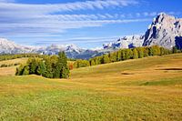 De Alpe di Siusi is een hoge alpenweide in de Dolomieten (natuurpark Sciliar-Rosengarten) en biedt een prachtig uitzicht op de Dolomieten, rechts de Sassolungo en Sasso Piatto groepen. Italië, Zuid-Tirol, Alto Adige, herfst 2017.