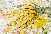 Prachtig gekleurde gele en oranje bladeren betekent dat de herfst volop bezig is. De beukenbomen verkleuren in de mooiste tinten. Deze foto is gemaakt onder de beuken van de Veluwezoom. De foto is van onder gericht naar de kronen van de bomen.