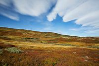 Genieten van de prachtige natuur in Noorwegen. Met de beginnende warme herfst kleuren. Blauwe lucht met wat witte wolken.