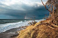 Donkere wolken en een regenboog boven de herfstige Oostzee, op het westelijk strand aan de Darß.