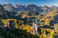 Werelderfgoed Kasteel Neuschwanstein op een zonnige herfstochtend met de sneeuwvrije Allgäuer Alpen in Beieren op de achtergrond.