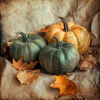 Een rustiek stilleven ontvouwt zich in zachte kleuren, waar groene en gouden pompoenen rusten op een bed van verwelkte bladeren. De gebogen stengels reiken in de lucht en vertellen over herfstdagen, terwijl het verfrommelde, bruine papieren behang een nostalgische warmte uitstraalt. Een vleugje gezelligheid doordringt deze herfstige…