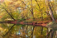 Herfst in het Molenbosch Zeist Utrecht. En bos vol kleine paden en bruggetjes en vijvers. Heerlijke herfstplaat. Reflectie in het water door de stilte van de ochtend